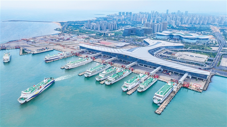 近日,海口新海港汽车客货滚装码头,船只往来,一派繁忙。