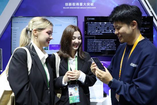 11月6日,进博会中国馆,科大讯飞股份有限公司工作人员(右一)向外国观众介绍讯飞翻译机。