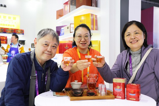 11月6日,进博会安徽展区,参展商和参观人员一起展示祁门红茶。