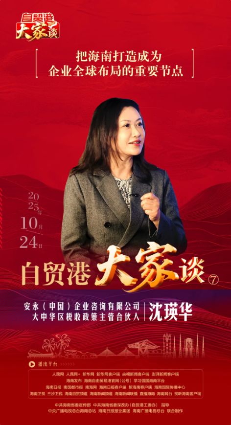 海南自由贸易港全岛封关运作将于2025年12月18日正式启动。全岛封关后,海南自贸港哪些领域会成为企业投资的首选?零关税、低税率等政策会为企业带来什么利好?安永是全球领先的专业服务机构,10月24日,《自贸港“大家”谈》大型访谈节目,将播出第七期,对话安永(中国)企业咨询有限公司大中华区税收政策主管合伙人沈瑛华。