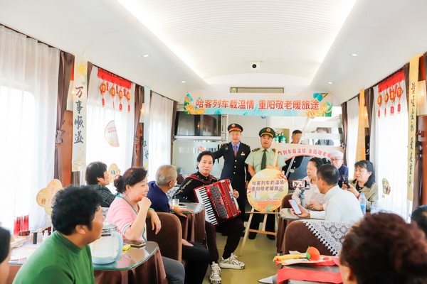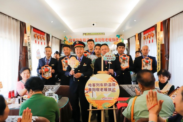 Z114次列车单程运行47小时47分钟,途经23个站点,自北向南跨越八个省份,是中国铁路哈尔滨局集团有限公司唯一一趟由哈尔滨开往海南的跨海列车。重阳节当日,担当乘务工作的哈尔滨客运段海口车队四组提前将列车餐车精心布置成节日舞台,乘务人员设置了重阳主题“旅拍”场景,与旅客一同制作香囊、开展诗词抢答,让传统节日焕发新的温度。