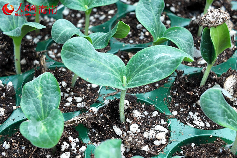 三亚市育才生态区那受村集体产业的百亩大棚基地内培育的秧苗。 人民网记者 孟凡盛摄