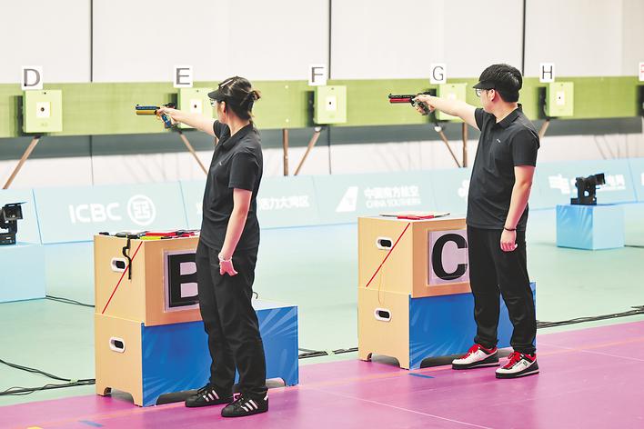 10月18日,安徽一队选手姚千寻/胡凯(右)在比赛中。最终,安徽一队获得冠军。当日,第十五届全运会射击10米气手枪混合团体决赛在广州举行。